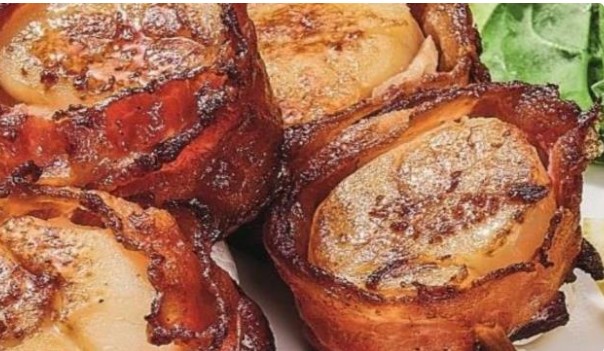 Bacon-Wrapped Sea Scallops Bacon-Wrapped Sea Scallops $16.99 | 450 Calories Four sea scallops wrapped in bacon and served with spring mix. Related